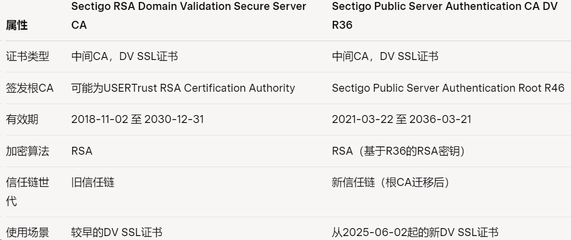 “Sectigo Public Server Authentication CA DV R36”和“Sectigo RSA Domain Validation Secure Server CA”都是DV SSL证书的中间CA,但它们属于不同的信任链世代。新证书是Sectigo根CA迁移的一部分,旨在为未来提供更强的安全性和兼容性。管理员应关注2025年6月2日的迁移日期,确保网站使用新证书链。